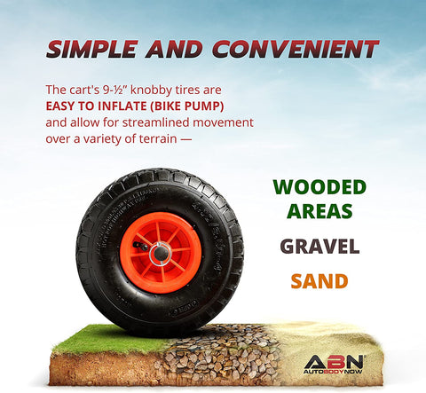 Tire Design: 9.5” knobby tires that are easy to inflate; Allows for smooth movement across rough surfaces such as sand, gravel, and through wooded areas